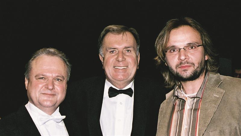 Vronský, Petr, Jaroslav Vocelka a Ján Ďurovčík po premiéře baletu Má vlast (SOP, 8.12.2005)