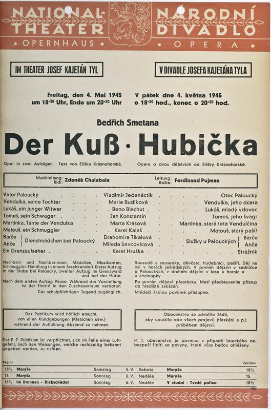 Hubička - 09.02.1923, divadelní cedule k repríze 4. 5. 1945