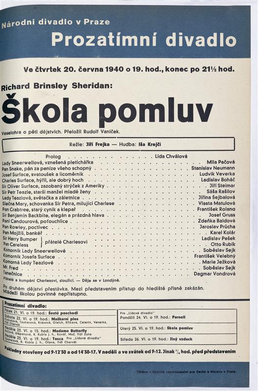 Škola pomluv - 24.05.1940, divadelní cedule (repríza)