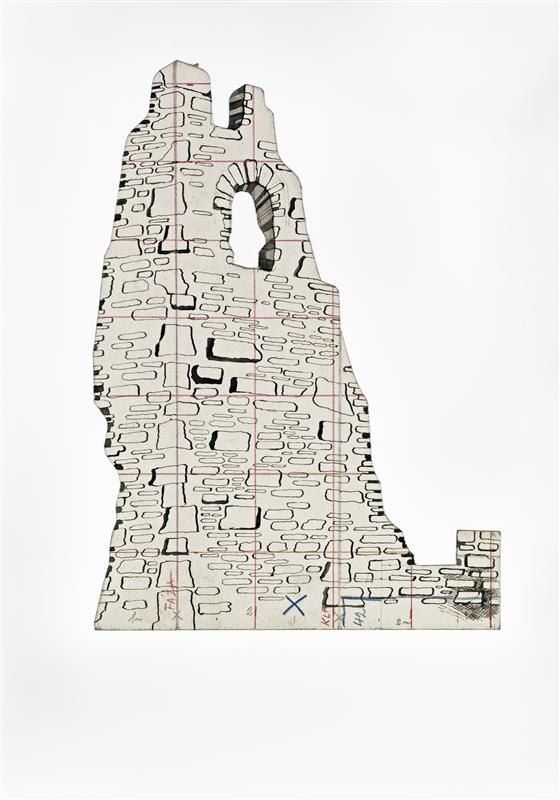 Tajemství - 15.04.1944, Karel Svolinský - výřez rozkresu rozvalin před kostelem (II. dějství)