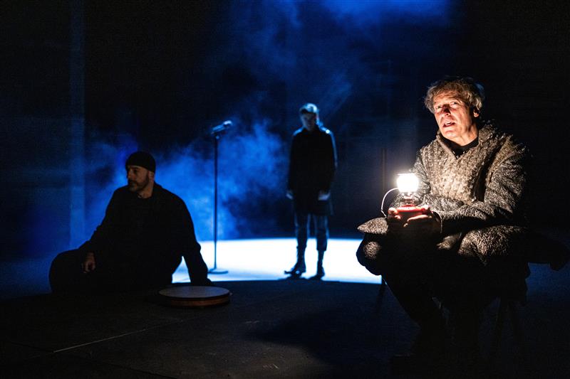 Hamlet - 07.12.2023, David Prachař (Herec), v pozadí: Csongor Kassai (Duch), Pavel Neškudla (Hamlet)