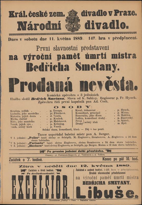 Prodaná nevěsta - 23.11.1883, divadelní cedule z reprízy 11.05.1889
