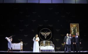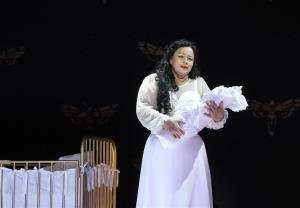 Maškarní ples - 05.10.2017, celková scéna, v popředí Veronika Hajnová (Ulrica Arvidson), Sbor ND