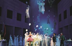 Bohéma 24.04.2003 René Tuček (Alcindoro), Marina Vyskvorkina (Musetta), členové sboru