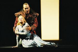 Lucia di Lammermoor 30.09.2004 G. Beláček (Raimondo), V. Kříž (Enrico), S. Houda-Šaturová (Lucia)