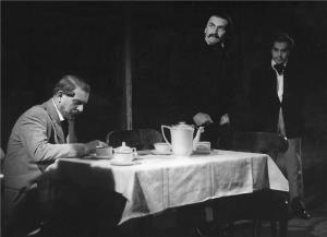 Milenci z kiosku - 10.03.1932, H. Haas (Sokrates), E. Kohout (Benjamin), O. Scheinpflugová (Helena)