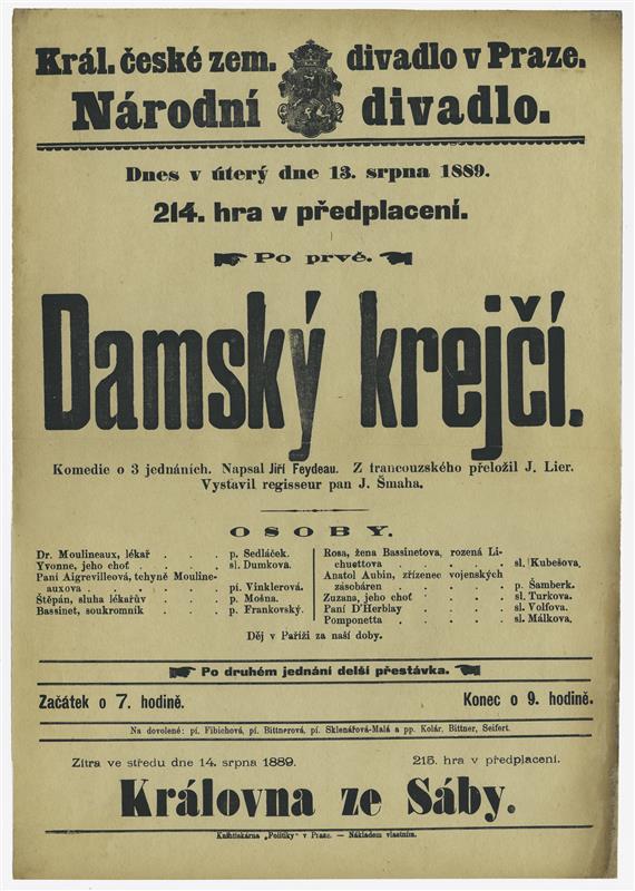 Dámský krejčí - 13.08.1889, divadelní cedule z premiéry